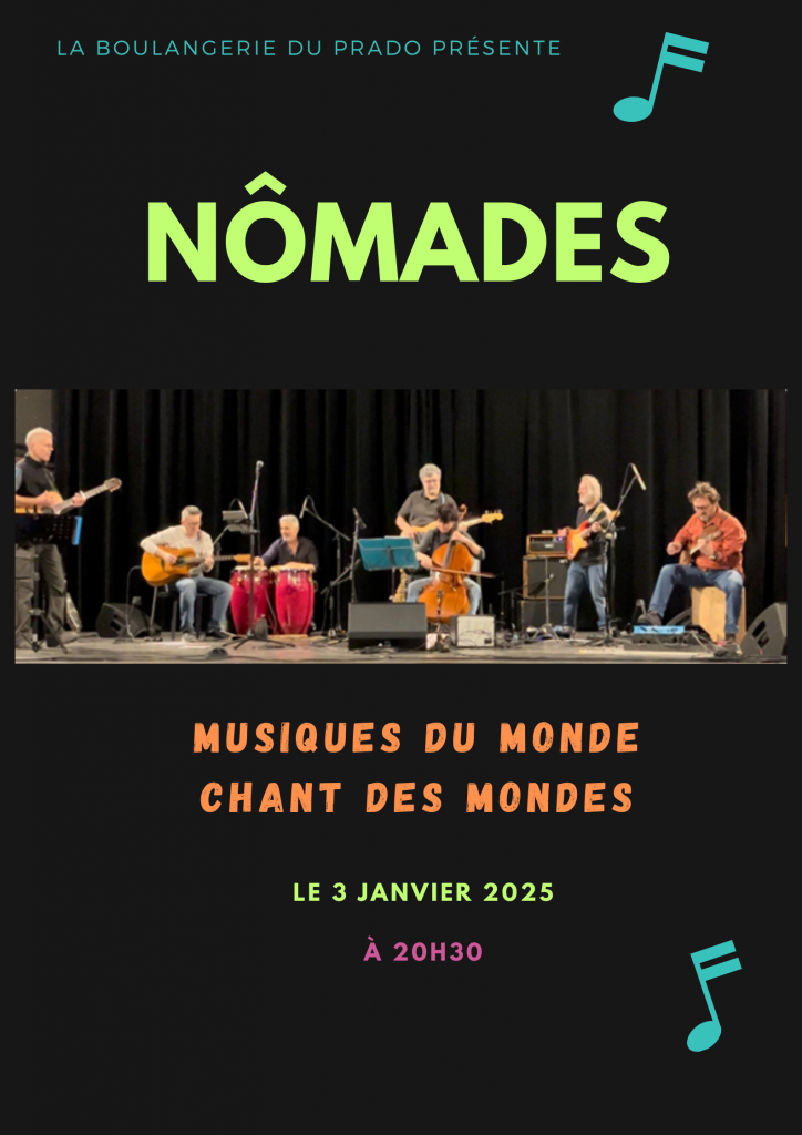 NÔMADES, c’est : Christian Chatillon (guitare, cajon), Florence Voir (saxophone, violoncelle), Franck Laurentin (guitare, chant, percus), Franck Richard (guitare), Jyann Mastan (basse), Ryad Chouchane (congas), Laurent Brun (guitare, trompette).