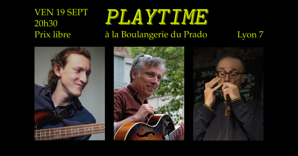 PlayTime, c’est un trio Guitare/Basse/Harmonica qui s’empare du langage jazz et de l’improvisation pour développer un espace sonore singulier, sensible et contemporain. Ce sont des atmosphères multiples et mouvantes, qui vous invitent au voyage et à la contemplation de paysages exotiques ou mystérieux.